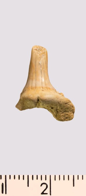Зуб. Акула. Scapanorhynchus gigas Woodward, 1889. Классификация: Хордовые Chordata, Позвоночные Vertebrata, Хрящевые рыбы Chondrichthyes, Пластиножаберные Elasmobranchii