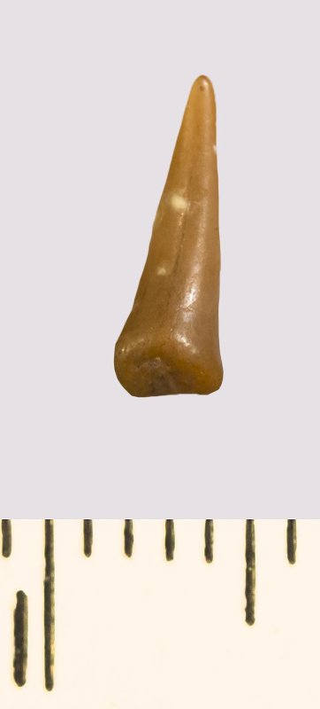 Зуб (фрагмент). Акула. Odontaspis subulata (Agassiz, 1843). Классификация: Хордовые Chordata, Позвоночные Vertebrata, Хрящевые рыбы Chondrichthyes, Пластиножаберные Elasmobranchii