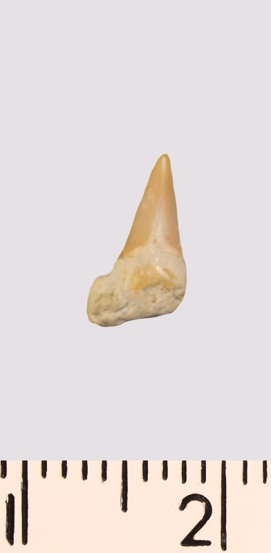 Зуб (фрагмент). Акула. Lamniformes gen. et sp. indet. Классификация: Хордовые Chordata, Позвоночные Vertebrata, Хрящевые рыбы Chondrichthyes, Пластиножаберные Elasmobranchii