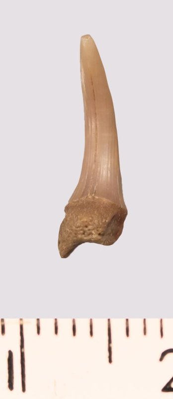 Зуб. Акула. Scapanorhynchus rhaphiodon Agassiz, 1843. Классификация: Хордовые Chordata, Позвоночные Vertebrata, Хрящевые рыбы Chondrichthyes, Пластиножаберные Elasmobranchii