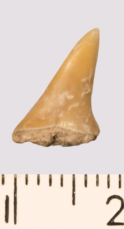 Зуб (фрагмент). Акула. Odontaspis venusta (Leriche, 1929). Классификация: Хордовые Chordata, Позвоночные Vertebrata, Хрящевые рыбы Chondrichthyes, Пластиножаберные Elasmobranchii
