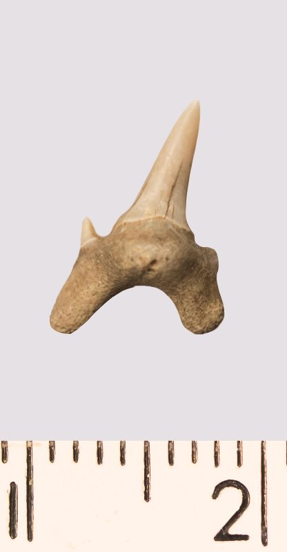 Зуб. Акула. Odontaspis macrorhiza (Cope) Leriche, 1902. Классификация: Хордовые Chordata, Позвоночные Vertebrata, Хрящевые рыбы Chondrichthyes, Пластиножаберные Elasmobranchii