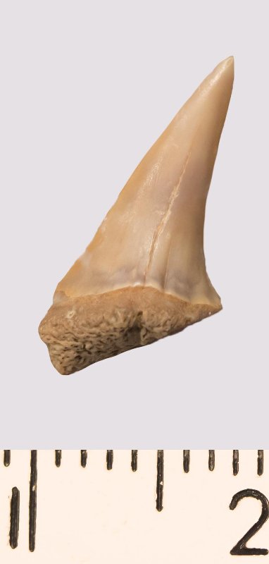 Зуб (фрагмент). Акула. Odontaspis venusta (Leriche, 1929). Классификация: Хордовые Chordata, Позвоночные Vertebrata, Хрящевые рыбы Chondrichthyes, Пластиножаберные Elasmobranchii