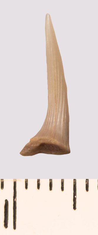 Зуб (фрагмент). Акула. Scapanorhynchus rhaphiodon Agassiz, 1843. Классификация: Хордовые Chordata, Позвоночные Vertebrata, Хрящевые рыбы Chondrichthyes, Пластиножаберные Elasmobranchii