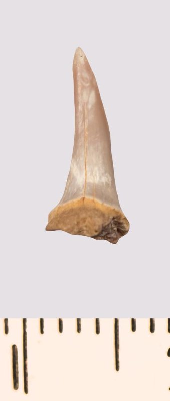 Зуб (фрагмент). Акула. Scapanorhynchus rhaphiodon Agassiz, 1843. Классификация: Хордовые Chordata, Позвоночные Vertebrata, Хрящевые рыбы Chondrichthyes, Пластиножаберные Elasmobranchii