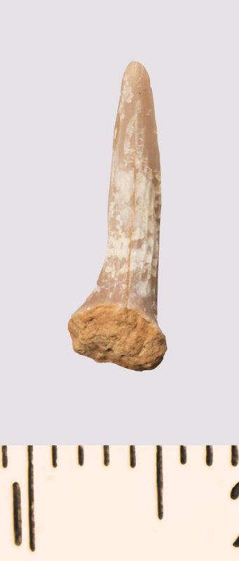 Зуб (фрагмент). Акула. Scapanorhynchus rhaphiodon Agassiz, 1843. Классификация: Хордовые Chordata, Позвоночные Vertebrata, Хрящевые рыбы Chondrichthyes, Пластиножаберные Elasmobranchii