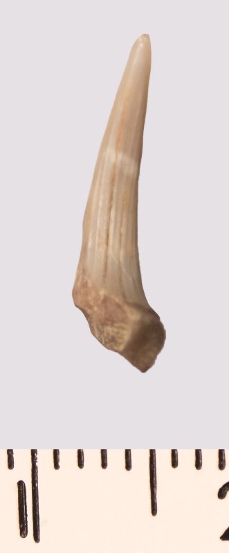 Зуб (фрагмент). Акула. Scapanorhynchus rhaphiodon Agassiz, 1843. Классификация: Хордовые Chordata, Позвоночные Vertebrata, Хрящевые рыбы Chondrichthyes, Пластиножаберные Elasmobranchii