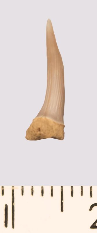 Зуб (фрагмент). Акула. Scapanorhynchus rhaphiodon Agassiz, 1843. Классификация: Хордовые Chordata, Позвоночные Vertebrata, Хрящевые рыбы Chondrichthyes, Пластиножаберные Elasmobranchii
