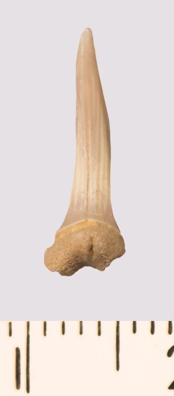Зуб (фрагмент). Акула. Scapanorhynchus rhaphiodon Agassiz, 1843. Классификация: Хордовые Chordata, Позвоночные Vertebrata, Хрящевые рыбы Chondrichthyes, Пластиножаберные Elasmobranchii