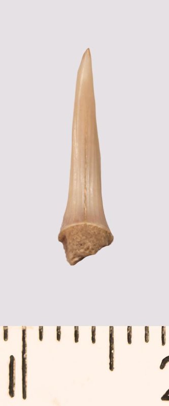 Зуб (фрагмент). Акула. Scapanorhynchus rhaphiodon Agassiz, 1843. Классификация: Хордовые Chordata, Позвоночные Vertebrata, Хрящевые рыбы Chondrichthyes, Пластиножаберные Elasmobranchii