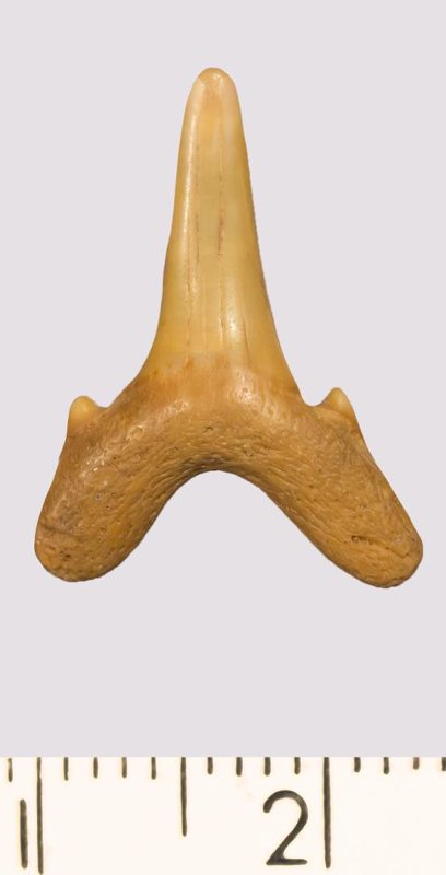 Зуб. Акула. Rhaphiodus sp. Классификация: Хордовые Chordata, Позвоночные Vertebrata, Хрящевые рыбы Chondrichthyes, Пластиножаберные Elasmobranchii