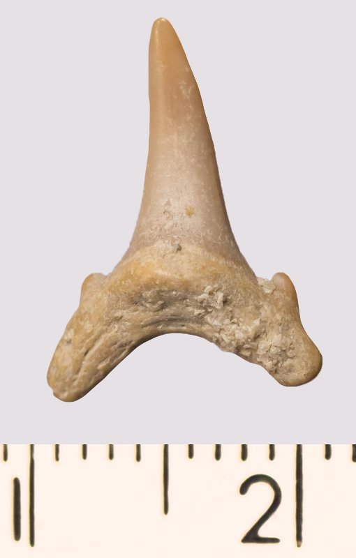 Зуб. Акула. Odontaspis venusta (Leriche, 1929). Классификация: Хордовые Chordata, Позвоночные Vertebrata, Хрящевые рыбы Chondrichthyes, Пластиножаберные Elasmobranchii
