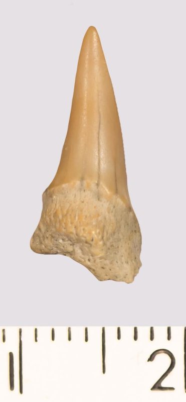 Зуб (фрагмент). Акула. Odontaspis macrorhiza (Cope) Leriche, 1902. Классификация: Хордовые Chordata, Позвоночные Vertebrata, Хрящевые рыбы Chondrichthyes, Пластиножаберные Elasmobranchii