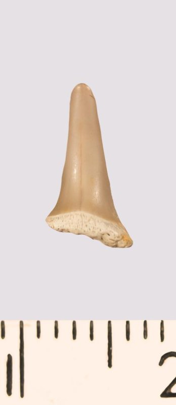 Зуб (фрагмент). Акула. Odontaspis venusta (Leriche, 1929). Классификация: Хордовые Chordata, Позвоночные Vertebrata, Хрящевые рыбы Chondrichthyes, Пластиножаберные Elasmobranchii