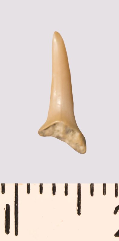 Зуб (фрагмент). Акула. Odontaspis venusta (Leriche, 1929). Классификация: Хордовые Chordata, Позвоночные Vertebrata, Хрящевые рыбы Chondrichthyes, Пластиножаберные Elasmobranchii