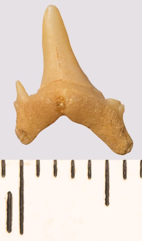 Зуб. Акула. Scapanorhynchus rhaphiodon Agassiz, 1843. Классификация: Хордовые Chordata, Позвоночные Vertebrata, Хрящевые рыбы Chondrichthyes, Пластиножаберные Elasmobranchii