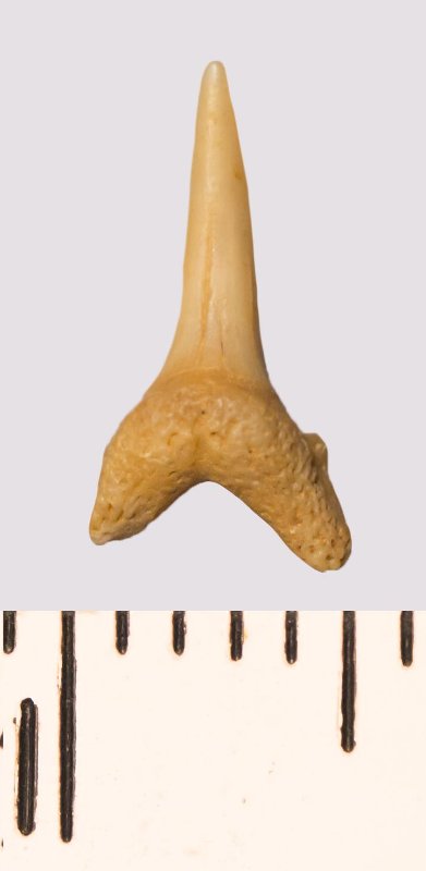 Зуб. Акула. Scapanorhynchus rhaphiodon Agassiz, 1843. Классификация: Хордовые Chordata, Позвоночные Vertebrata, Хрящевые рыбы Chondrichthyes, Пластиножаберные Elasmobranchii