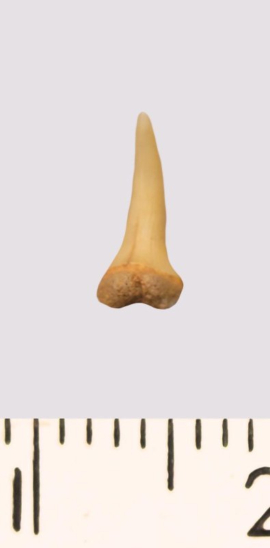 Зуб (фрагмент). Акула. Scapanorhynchus rhaphiodon Agassiz, 1843. Классификация: Хордовые Chordata, Позвоночные Vertebrata, Хрящевые рыбы Chondrichthyes, Пластиножаберные Elasmobranchii
