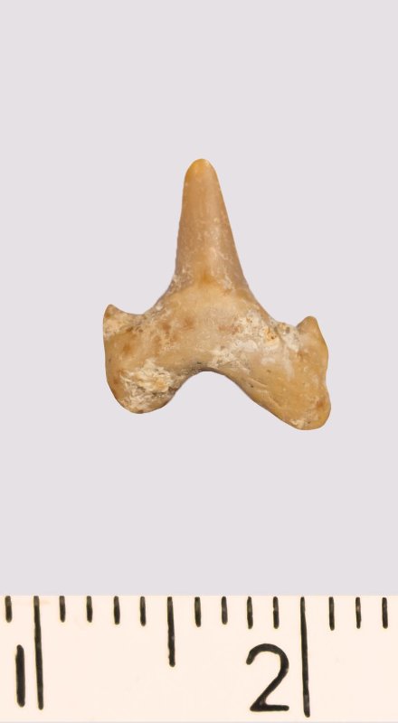 Зуб. Акула. Odontaspis macrorhiza (Cope) Leriche, 1902. Классификация: Хордовые Chordata, Позвоночные Vertebrata, Хрящевые рыбы Chondrichthyes, Пластиножаберные Elasmobranchii