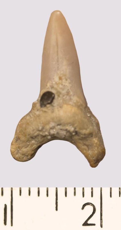 Зуб. Акула. Odontaspis macrorhiza (Cope) Leriche, 1902. Классификация: Хордовые Chordata, Позвоночные Vertebrata, Хрящевые рыбы Chondrichthyes, Пластиножаберные Elasmobranchii