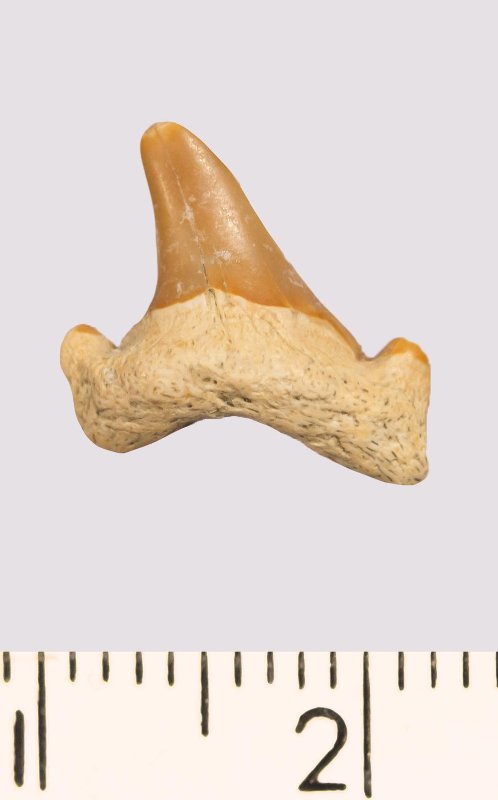Зуб. Акула. Odontaspis macrorhiza (Cope) Leriche, 1902. Классификация: Хордовые Chordata, Позвоночные Vertebrata, Хрящевые рыбы Chondrichthyes, Пластиножаберные Elasmobranchii