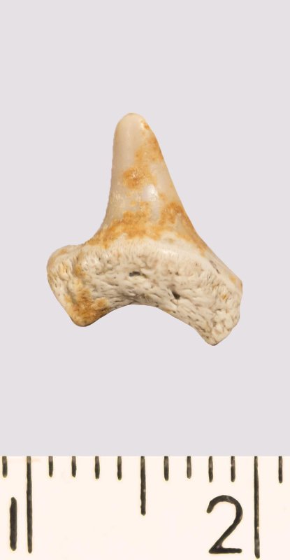 Зуб. Акула. Odontaspis macrorhiza (Cope) Leriche, 1902. Классификация: Хордовые Chordata, Позвоночные Vertebrata, Хрящевые рыбы Chondrichthyes, Пластиножаберные Elasmobranchii