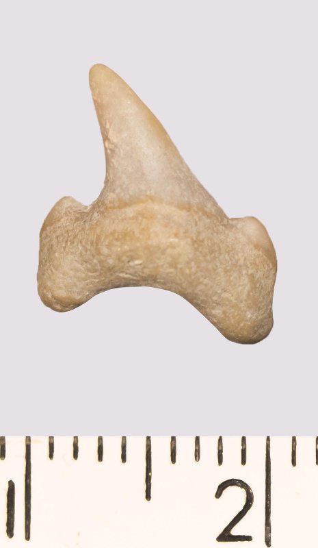 Зуб. Акула. Odontaspis macrorhiza (Cope) Leriche, 1902. Классификация: Хордовые Chordata, Позвоночные Vertebrata, Хрящевые рыбы Chondrichthyes, Пластиножаберные Elasmobranchii