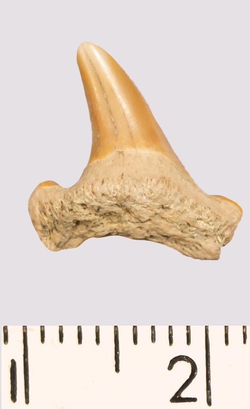 Зуб. Акула. Odontaspis macrorhiza (Cope) Leriche, 1902. Классификация: Хордовые Chordata, Позвоночные Vertebrata, Хрящевые рыбы Chondrichthyes, Пластиножаберные Elasmobranchii