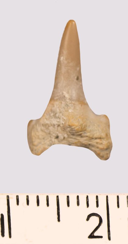 Зуб. Акула. Odontaspis macrorhiza (Cope) Leriche, 1902. Классификация: Хордовые Chordata, Позвоночные Vertebrata, Хрящевые рыбы Chondrichthyes, Пластиножаберные Elasmobranchii