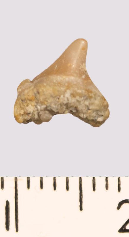 Зуб. Акула. Odontaspis macrorhiza (Cope) Leriche, 1902. Классификация: Хордовые Chordata, Позвоночные Vertebrata, Хрящевые рыбы Chondrichthyes, Пластиножаберные Elasmobranchii
