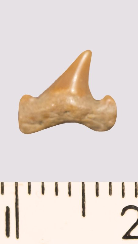 Зуб. Акула. Odontaspis macrorhiza (Cope) Leriche, 1902. Классификация: Хордовые Chordata, Позвоночные Vertebrata, Хрящевые рыбы Chondrichthyes, Пластиножаберные Elasmobranchii
