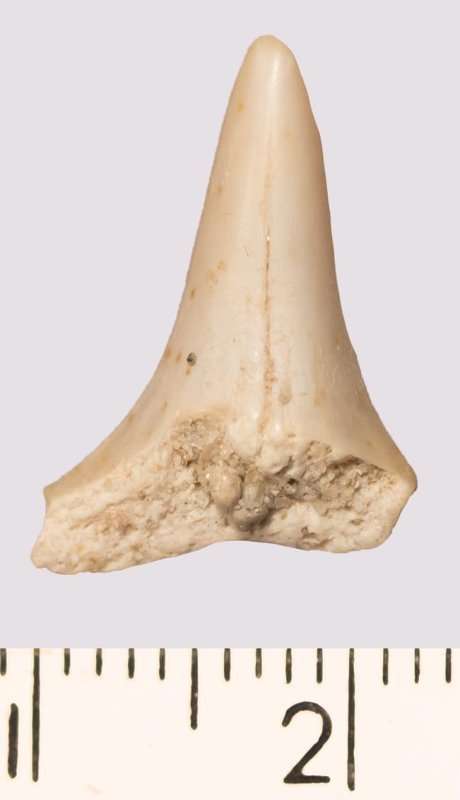 Зуб (фрагмент). Акула. Cretolamna sp. Классификация: Хордовые Chordata, Позвоночные Vertebrata, Хрящевые рыбы Chondrichthyes, Пластиножаберные Elasmobranchii