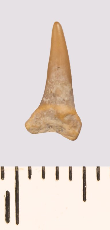 Зуб (фрагмент). Акула. Odontaspis venusta (Leriche, 1929). Классификация: Хордовые Chordata, Позвоночные Vertebrata, Хрящевые рыбы Chondrichthyes, Пластиножаберные Elasmobranchii