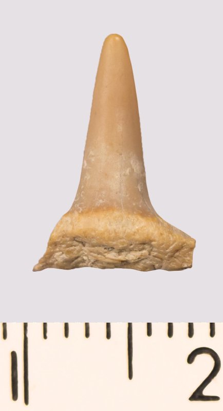 Зуб (фрагмент). Акула. Odontaspis venusta (Leriche, 1929). Классификация: Хордовые Chordata, Позвоночные Vertebrata, Хрящевые рыбы Chondrichthyes, Пластиножаберные Elasmobranchii
