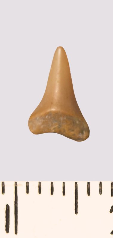 Зуб (фрагмент). Акула. Odontaspis venusta (Leriche, 1929). Классификация: Хордовые Chordata, Позвоночные Vertebrata, Хрящевые рыбы Chondrichthyes, Пластиножаберные Elasmobranchii