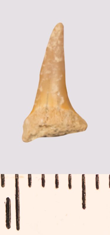 Зуб (фрагмент). Акула. Odontaspis venusta (Leriche, 1929). Классификация: Хордовые Chordata, Позвоночные Vertebrata, Хрящевые рыбы Chondrichthyes, Пластиножаберные Elasmobranchii