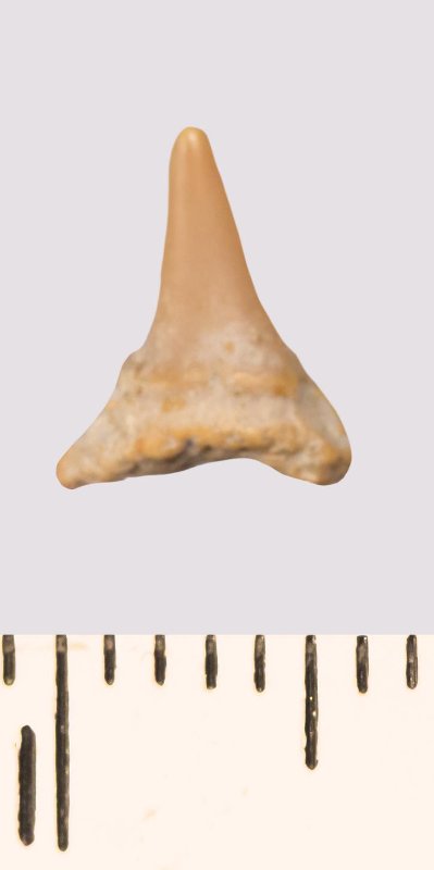 Зуб (фрагмент). Акула. Odontaspis venusta (Leriche, 1929). Классификация: Хордовые Chordata, Позвоночные Vertebrata, Хрящевые рыбы Chondrichthyes, Пластиножаберные Elasmobranchii
