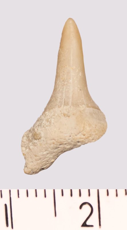 Зуб. Акула. Odontaspis macrorhiza (Cope) Leriche, 1902. Классификация: Хордовые Chordata, Позвоночные Vertebrata, Хрящевые рыбы Chondrichthyes, Пластиножаберные Elasmobranchii