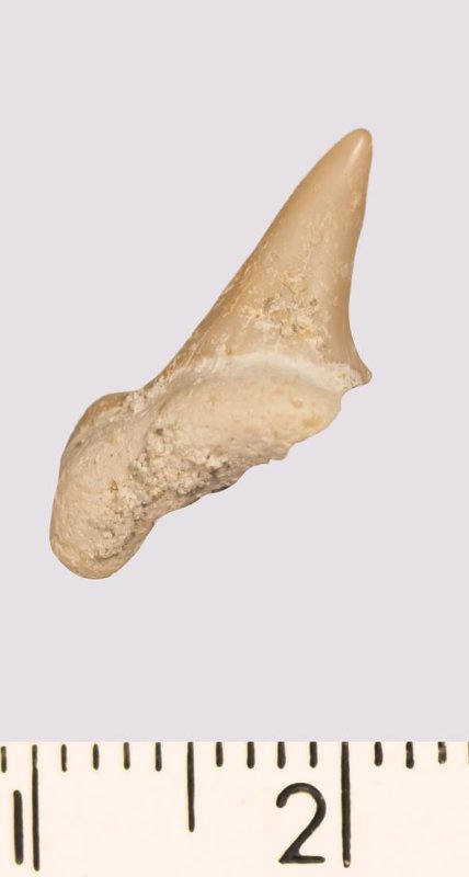 Зуб. Акула. Odontaspis macrorhiza (Cope) Leriche, 1902. Классификация: Хордовые Chordata, Позвоночные Vertebrata, Хрящевые рыбы Chondrichthyes, Пластиножаберные Elasmobranchii