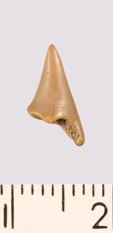 Зуб (фрагмент). Акула. Odontaspis venusta (Leriche, 1929). Классификация: Хордовые Chordata, Позвоночные Vertebrata, Хрящевые рыбы Chondrichthyes, Пластиножаберные Elasmobranchii