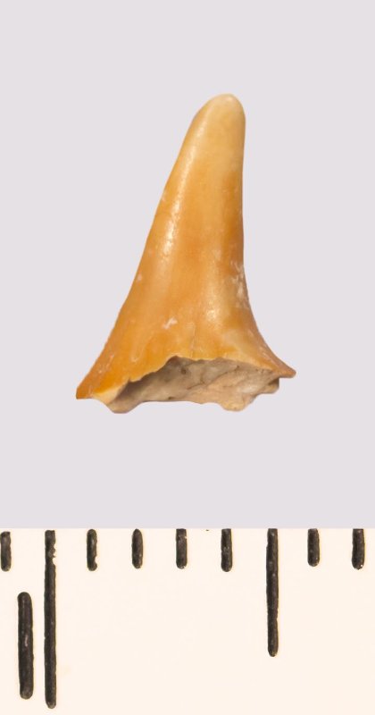 Зуб (фрагмент). Акула. Odontaspis venusta (Leriche, 1929). Классификация: Хордовые Chordata, Позвоночные Vertebrata, Хрящевые рыбы Chondrichthyes, Пластиножаберные Elasmobranchii