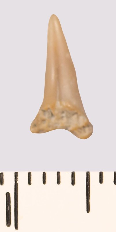 Зуб (фрагмент). Акула. Odontaspis venusta (Leriche, 1929). Классификация: Хордовые Chordata, Позвоночные Vertebrata, Хрящевые рыбы Chondrichthyes, Пластиножаберные Elasmobranchii