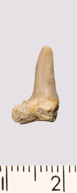 Зуб. Акула. Scapanorhynchus gigas Woodward, 1889. Классификация: Хордовые Chordata, Позвоночные Vertebrata, Хрящевые рыбы Chondrichthyes, Пластиножаберные Elasmobranchii