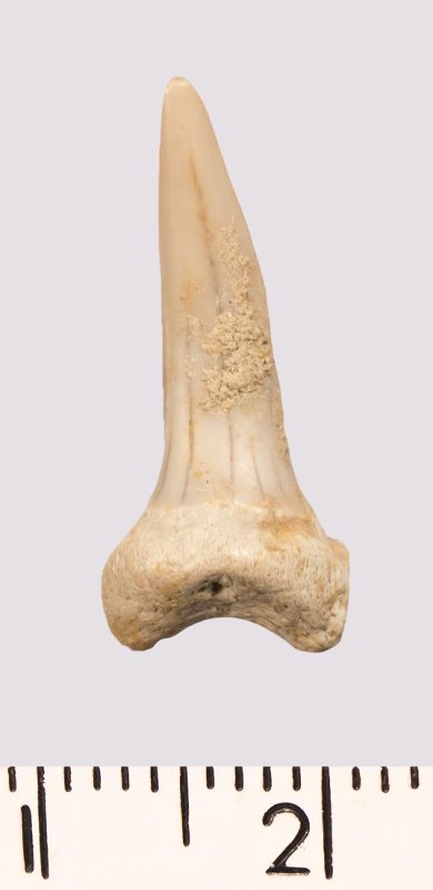Зуб. Акула. Scapanorhynchus gigas Woodward, 1889. Классификация: Хордовые Chordata, Позвоночные Vertebrata, Хрящевые рыбы Chondrichthyes, Пластиножаберные Elasmobranchii