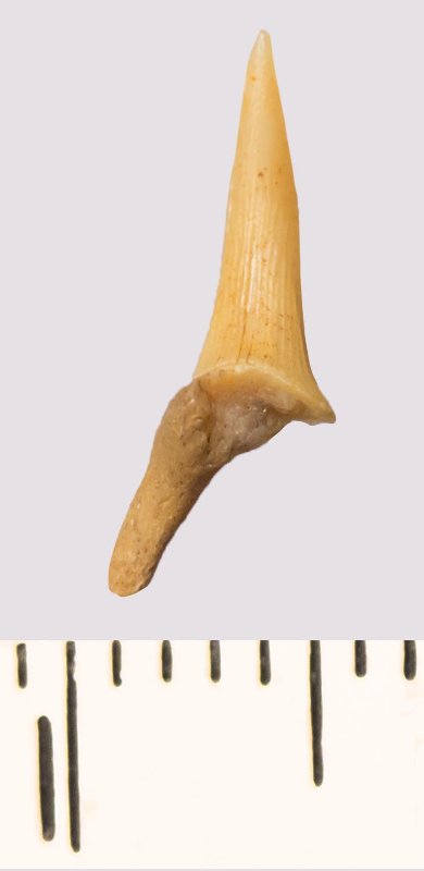 Зуб. Акула. Scapanorhynchus rhaphiodon Agassiz, 1843. Классификация: Хордовые Chordata, Позвоночные Vertebrata, Хрящевые рыбы Chondrichthyes, Пластиножаберные Elasmobranchii