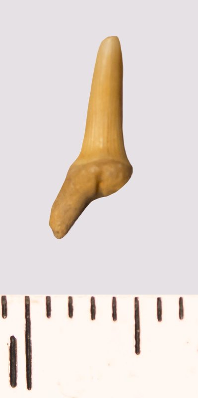 Зуб. Акула. Scapanorhynchus rhaphiodon Agassiz, 1843. Классификация: Хордовые Chordata, Позвоночные Vertebrata, Хрящевые рыбы Chondrichthyes, Пластиножаберные Elasmobranchii
