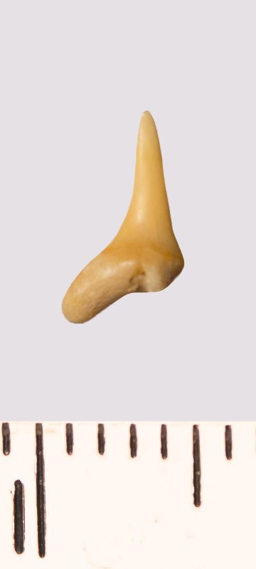 Зуб. Акула. Scapanorhynchus rhaphiodon Agassiz, 1843. Классификация: Хордовые Chordata, Позвоночные Vertebrata, Хрящевые рыбы Chondrichthyes, Пластиножаберные Elasmobranchii