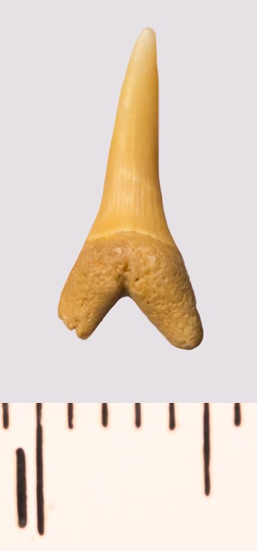 Зуб. Акула. Scapanorhynchus rhaphiodon Agassiz, 1843. Классификация: Хордовые Chordata, Позвоночные Vertebrata, Хрящевые рыбы Chondrichthyes, Пластиножаберные Elasmobranchii
