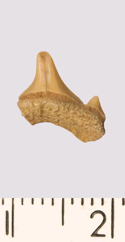 Зуб. Акула. Odontaspis striatula Dalinkevicius, 1935. Классификация: Хордовые Chordata, Позвоночные Vertebrata, Хрящевые рыбы Chondrichthyes, Пластиножаберные Elasmobranchii