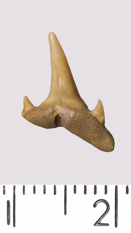 Зуб. Акула. Odontaspis striatula Dalinkevicius, 1935. Классификация: Хордовые Chordata, Позвоночные Vertebrata, Хрящевые рыбы Chondrichthyes, Пластиножаберные Elasmobranchii